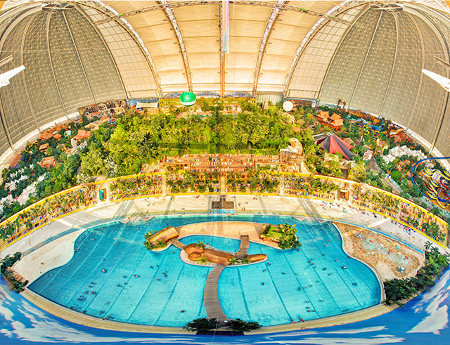 2. 德國・Tropical Islands 原本建造用途是飛船庫,誰料搖身一變,這座全球最大的獨立建築物,成為了最大型的室內水上樂園。除了逾5萬棵植物的熱帶雨林、全球最大長約200米的室內游泳池,設施要還有多誇張有多誇張,室內熱氣球、自由落體塔、空中雜技表演,加上酒店和夜店,堪稱是一座迷你的水中城。離柏林以南只一小時車程,絕對是渡假之選。